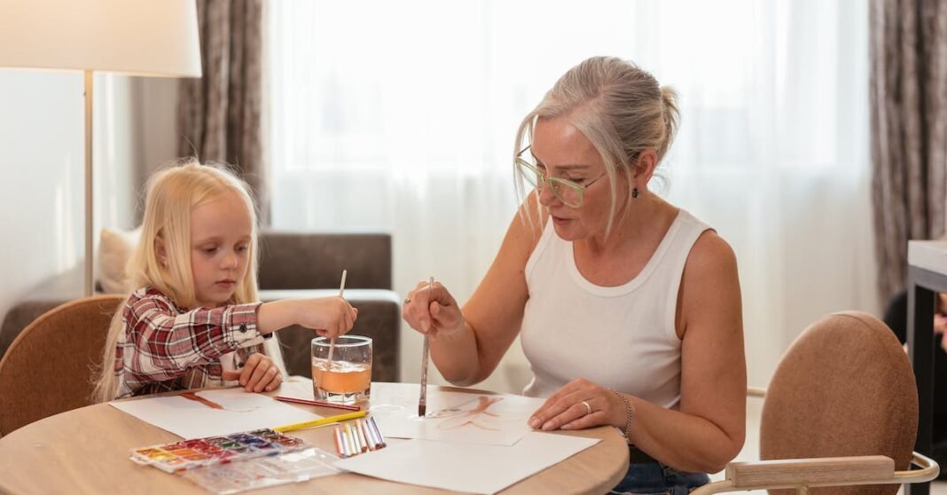 To get your kids ready for some fun watercolor time at the kitchen table, put down a layer of newspaper or a plastic tablecloth first. This protects your kitchen table and lets your kids’ creativity go wild, and you’re not stressing out about paint staining the table for years to come.